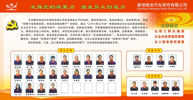 中(zhōng)共衢州丝瓜在线视频(yè)汽(qì)車部件有限公司黨支部成立於2008年,現有黨員22名,鑄造支(zhī)部4名,流動黨員5名。秉著(zhe)“把骨幹培養成黨員,把黨員培養成骨幹”的理念,通過“三手六爪工作法”將黨的建設與企業發(fā)展深度融合,以文化(huà)為平台,以製度為抓手,以隊伍為關鍵,以陣地為保障,不斷提增基層黨組織的創造力、凝聚力和戰鬥力,推(tuī)動企業(yè)走(zǒu)上科學化、製度(dù)化、規範化的發展之路,真(zhēn)正做到黨建引領、文化熏陶、全麵滲透(tòu)、深度融合、凝(níng)心聚力、和諧共進。黨支部多次被區委、開發區黨工委評為“先進基層黨組織”。黨(dǎng)支部書記祝小明先後(hòu)榮獲衢州市、柯城區“優秀共(gòng)產黨員”稱號,支部委員林梅、方(fāng)雲山(shān)多次榮獲開發區“優秀共(gòng)產黨(dǎng)員”稱號(hào)。